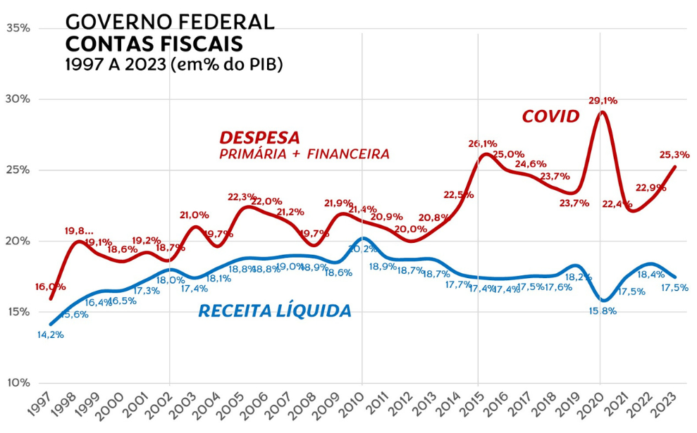 Nossas contas fiscais no vermelho têm três causas principais: (1) origem administrativa, quando gastamos além da receita, sem nem perguntar por quê, quando empregamos no setor público sem calcular o custo de mais um servidor no longo prazo (seus benefícios e mordomias, quando ativo; sua aposentadoria, pensão e saúde, quando inativo); (2) origem previdenciária, pelo vermelho estrutural dos vários planos existentes — os do INSS e dos múltiplos “regimes especiais”, sempre deficitários — cujos rombos são arcados pelos empregados “de carteira assinada” e, também, por todos nós, consumidores, através da Cofins embutida em cada produto ou serviço prestado; (3) por fim, a origem financeira do déficit, sempre escamoteada da visão do público. O impacto dos altos juros que o Tesouro e Banco Central se conformam em pagar para rolar seus papéis no mercado, os encargos mais elevados do planeta, são excluídos da despesa “total” no Relatório do Banco Central. Essa última conta, a de juros da dívida pública, é mesmo endiabrada. Em 2023, o estouro superou os R$ 600 bilhões. Mas há outras fogueiras nesse inferno: a previdência social do INSS consumiu R$ 900 bilhões, perfazendo um déficit, só nesta rubrica, de cerca de R$ 300 bi. É muita folia para pouco Diabo.